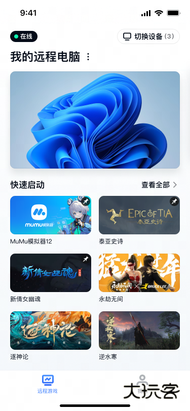2、点击 UU远程 主页右上角-切换设备按钮,在弹出的设备界面内,选择需要切换的远程设备即可。