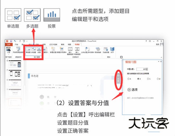 点击所需题型,添加题目(雨课堂目前支持插入单选、多选和投票题)