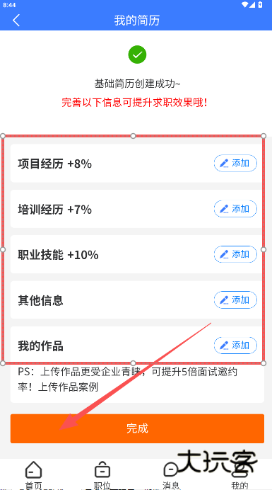 6、基础简历创建完毕以后,软件内还会根据你所编辑部分,做出针对性建议,可依照它所给出的提示完成修改发布。