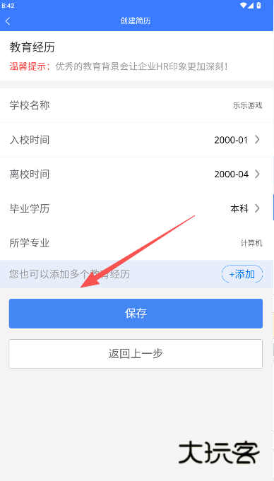 5、最后,来到个人教育经历,为适应现代企业工作发展,个人学历部分是必不可少的,也是最为重要的,添加自己的大学经历以及其他教育经历,只要是有的都是加分项。