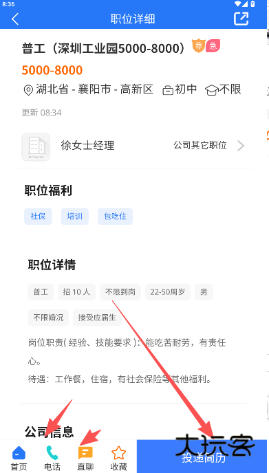 5、有自己感兴趣的公司岗位,可添加收藏投递简历,待企业回复后,可以选择在线直聊或是电话的方式完成求职沟通,以满足自己的求职需要,看是否达标。