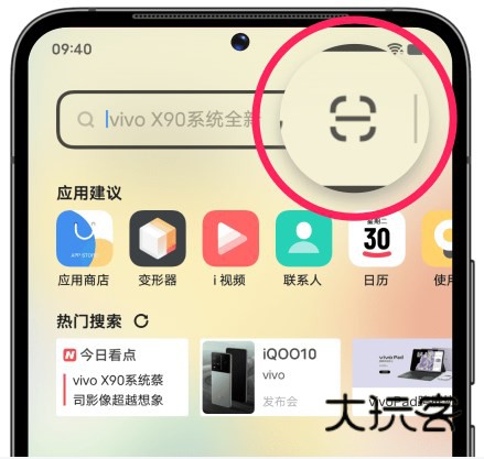 2、在手机/平板的桌面中间下滑调出“全局搜索”页面,点击右上角的“扫码”图标,扫描电脑的二维码进行连接。