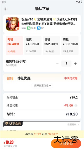 3、租用x小时,免费获得x小时。价格不变,但快乐倍增。专业级别的账户保护和防作弊技术,确保出租人账户安全。