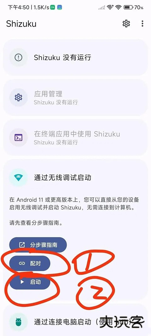 2、打开shizuku,按照步骤配对,配对完成后,点启动。