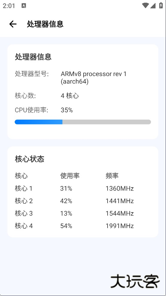 显示CPU核心负载、内存占用、电池电量及存储空间。