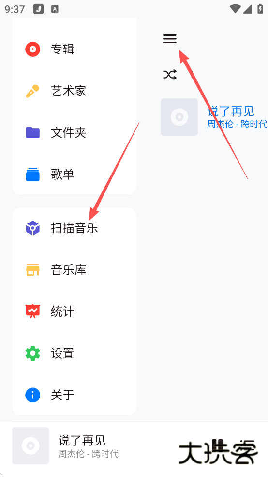 1、点击功能菜单后,再点击扫描音乐