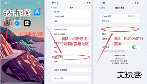 ❸点击手机设置(图1)-点击通用,找到语言与地区(图2)-把地区改为美国(图3)。
