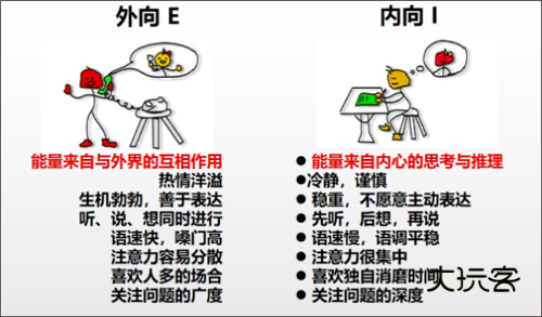 ◆根据个人的能量更集中的指向分为:外倾型(E)-内倾型(I)