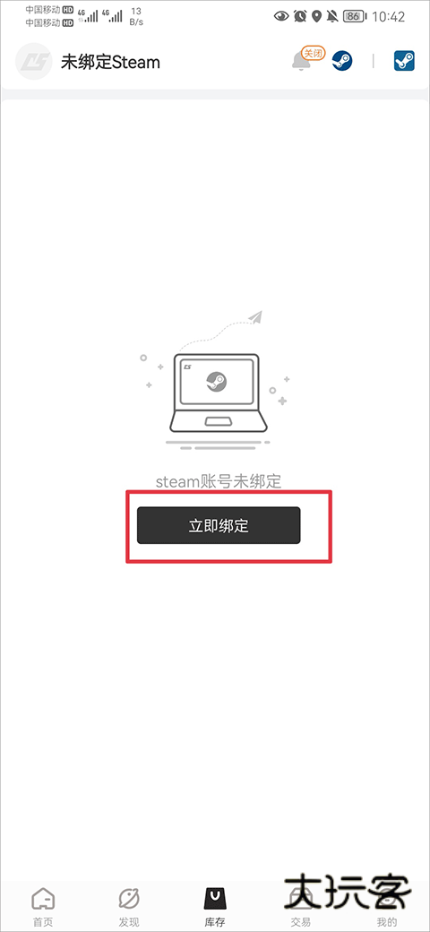 1、打开c5game app后,首先在库存界面中点击立即绑定。