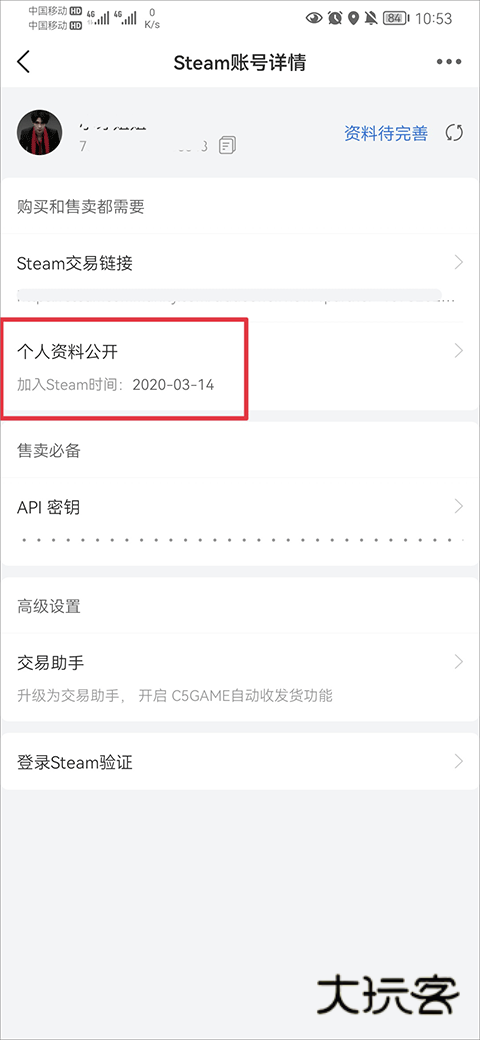 2、然后在steam账号详情界面中找到个人资料公开,并点击进入。