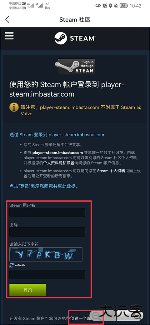 2、在steam社区界面中输入steam用户名、密码、字符后点击登录即可,若用户没有steam帐户可以点击下方创建一个新的帐户,创建完成后在重复上方操作进行登录即可完成绑定。