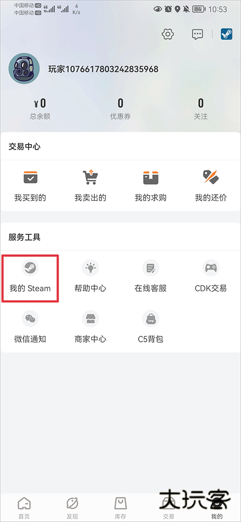 1、在我的界面中的服务工具内点击我的steam。