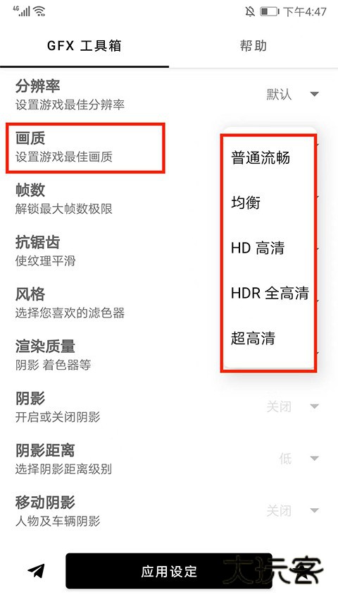 4、可看到包括普通流畅、均衡、HD高清、HDR全高清和超高清选项,越往下说明效果越好,用户可根据手机配置情况自行选择,