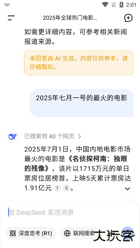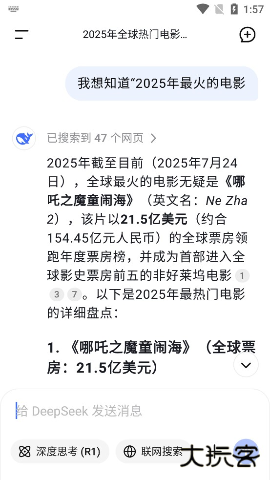 1、在搜索框里输入想找的内容,就比如想知道“2025年最火的电影”,直接输入再搜索,果然是《哪吒之魔童闹海》。就是在搜索之前要先想清楚要找什么,如果直接搜“电影”,太广泛了结果肯定不准确。