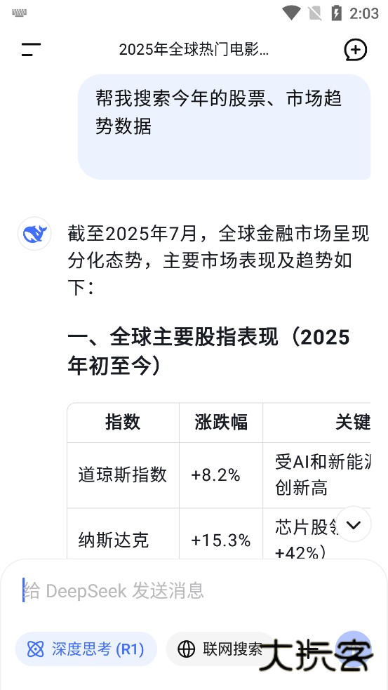 1、家里有人喜欢炒股,就需要搜索数据,比如股票、市场趋势等,DeepSeek就会直接生成图表,一眼就能看懂。【可以开启深度思考功能更为广泛】