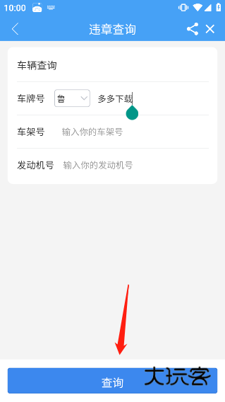 2、输入车牌号、车架号、发动机号等各项车辆数据后,点击“查询”即可快速查找最近违章情况