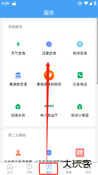 1、进入app“服务”栏目内,我们可查询天气、快递、水务等各种本地服务,如下图所示即为违章查询位置