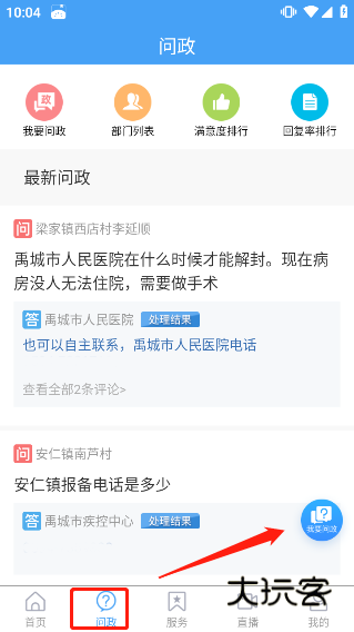5、如果用户有各种信息问题也可点击下图所示“问政”中的“我要问政”,当然这需要用户注册并登录账号