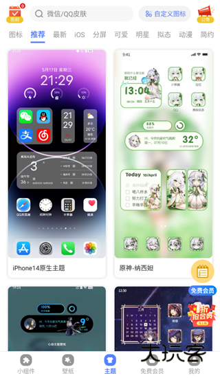 1、心动主题壁纸拥有很多小组件和壁纸,有些需要会员但是也有很多免费的。