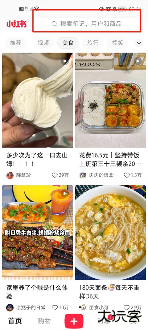 2、进入到软件后,可以选择上面的美食,进入到美食页面,就可以看到很多的美食分享,也可以选择右上角来搜索你想了解的美食。