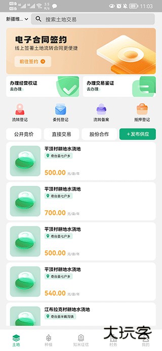 提供了线上土地流转办理的服务,可以随时对自己的土地确权人进行信用办理。