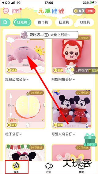 1、下载好软件直接打开首页,选择娃娃机点击自己喜欢的娃娃公仔。