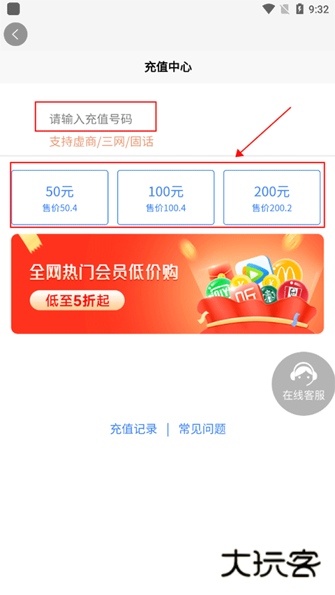 2、进入后在上方输入你要充值的手机号码,并选择充值的面额