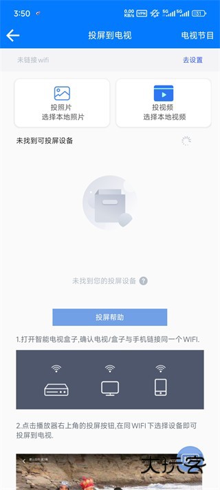 3、然后再投屏到电视界面中等待手机搜索电视设备,再点击设备即可投屏在电视上