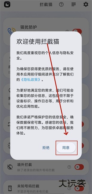 1、下载安装并打开拦截猫app,点击同意