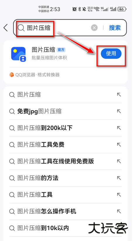 1、打开qq浏览器,先搜索图片压缩,然后点击使用。