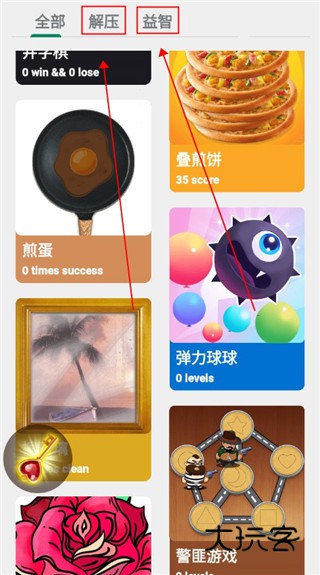 1、首先我们打开进入游戏,映入眼帘的是分为解压和益智两种不同版块的游戏,点击相应版本即可查看相关游戏。