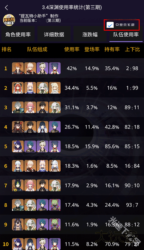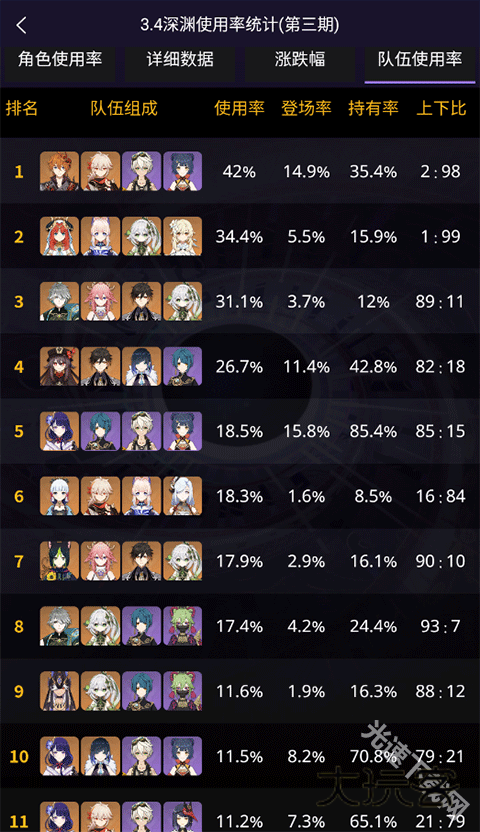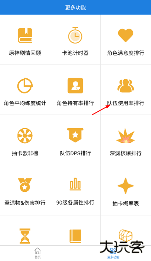 1、首先打开提瓦特小助手官方正版,在更多功能模块点击队伍使用率排行;