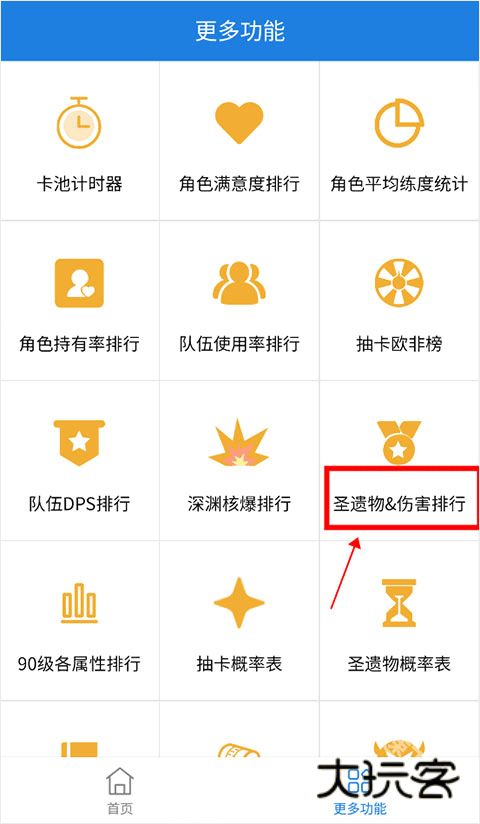 1、在“更多功能”页面选择“圣遗物/伤害排行”。