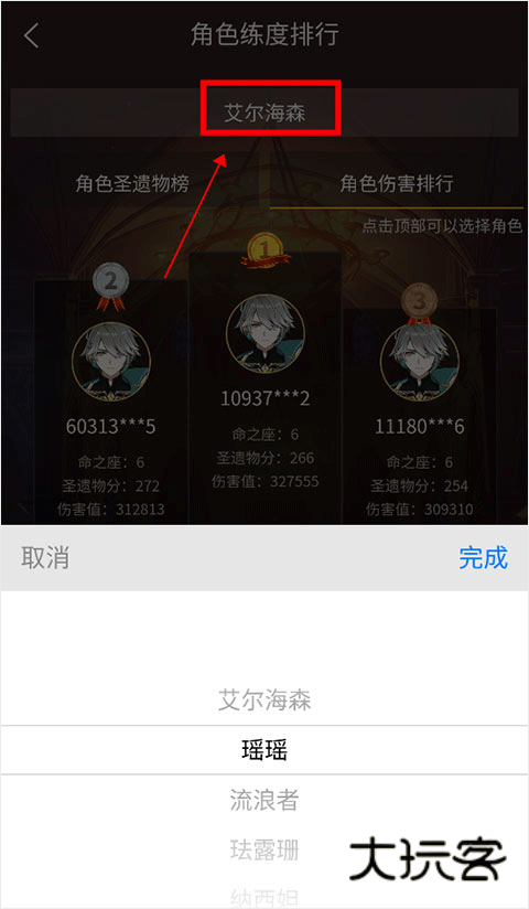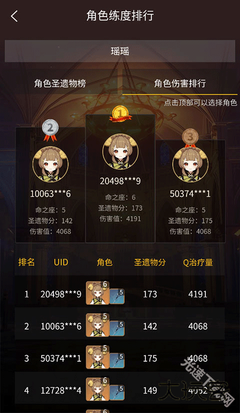 2、然后从上方的角色圣遗物榜切换到伤害榜,点击顶部的名称可以选择不同的角色进行查看。