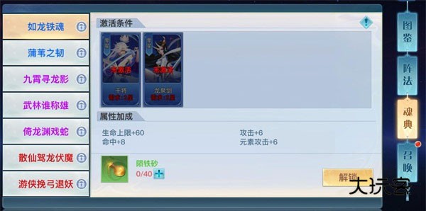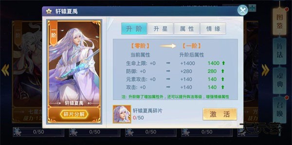 在图鉴界面中,玩家们能看到目前所收集的所有兵魂伙伴,点击卡片即可进入兵魂的养成界面,在这里可以消耗碎片对兵魂人物进行激活、升星,消耗陨铁砂可对兵魂伙伴进行升阶。