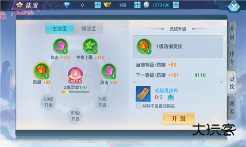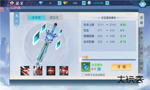手游的法宝强化主要有三大途径,分别为升级,律令和灵纹。升级计生法宝等级,等级越高战力加成越高。此外,玩家还可以使用律令刷新法宝的属性,每天有5次刷新法宝属性值的机会,每次刷出的法宝的属性高低也关系着战力增加的多少。最后玩家还能通过使用灵纹符来提升法宝属性,同样灵纹的等级越高战力增加的就越多。