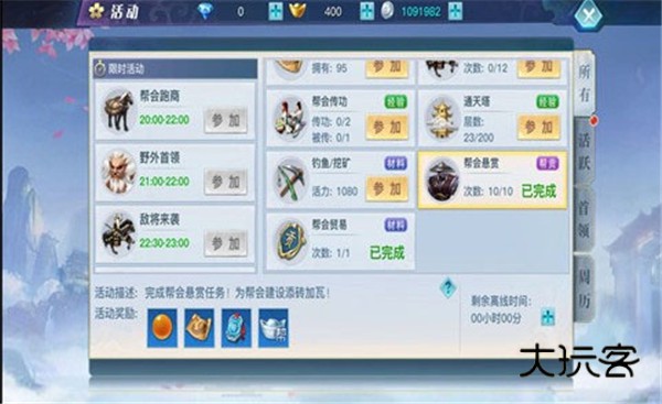 帮会悬赏是玩家获得“帮贡”的主要途径之一,玩家需要在“活动”界面参加帮会悬赏活动,通过在帮会领地内接取任务,完成相关的任务要求即可完成。帮会悬赏任务每人每天可完成十个,由于其任务内容是变化的,所以各位小伙伴一定要提前做好准备呦~