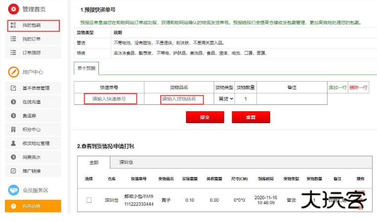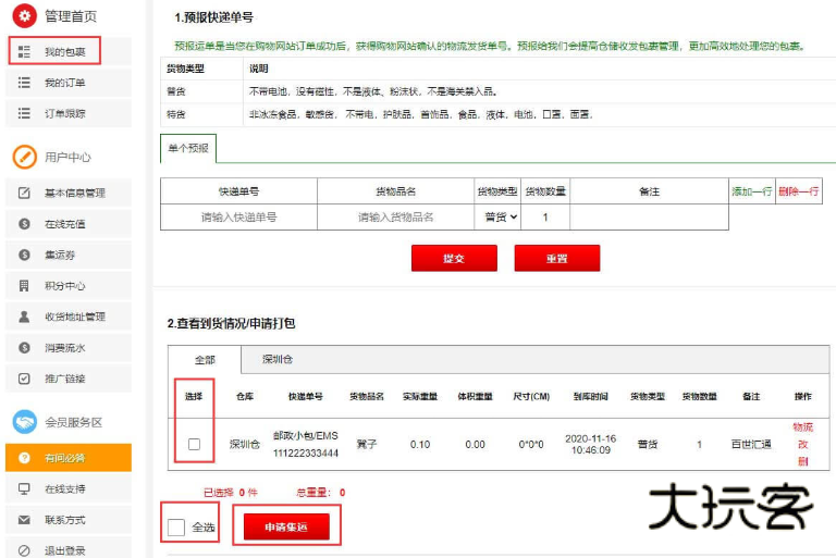 第四步:商品到齐后(系统里可以查看),登录会员系统,申请打包发货 ,并付款。