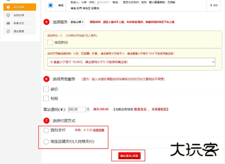 第八步 选择您香港的收货地址以及付款方式,然后确认集运并付款,付款成功就可等待货品配送了