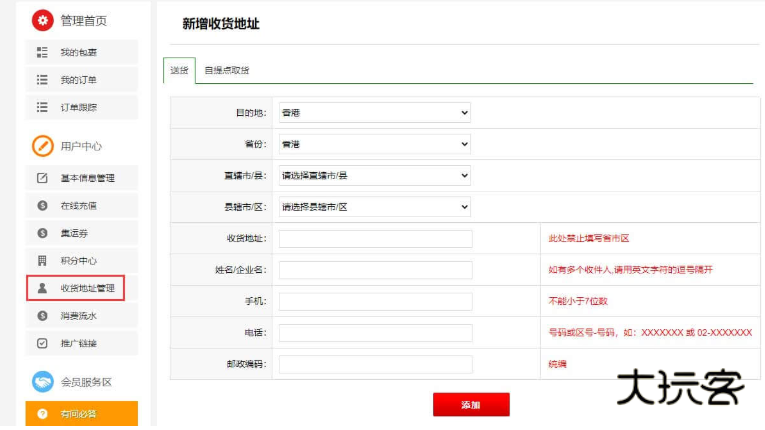第五步 在“收货地址管理”添加您香港的收货地址信息