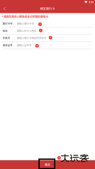 3、依次输入银行卡号、姓名、手机号和身份证号后点击最下方的“确定”按钮即可