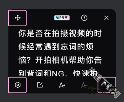 1、点击提词器顶部或左上角图标即可拖动任意位置,点击右下角图标即可调整提词器展示大小长宽度。
