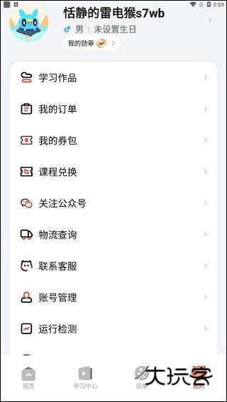 5、在“我的”也就是个人中心里,包含有学习作品的创建和课程管理,还有我的订单、我的券包和课程兑换等优惠福利,若在使用过程中有任何的问题,也可以在这里联系客服。