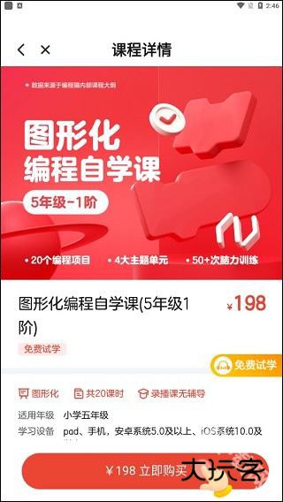 在“自学课程”里有免费试学,进入后有课程详情介绍,还有课程列表,支持的学习设备和适用的年级范围。