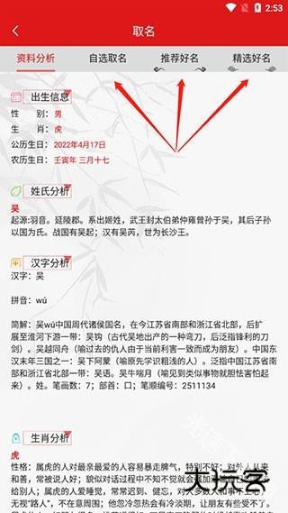 4. 命名也是在传统命名知识的基础上,通过层层信息筛选,以自选名、推荐名、天祥名三种方式符合用户操作。永远有一个好名字,让你的生活顺利!
