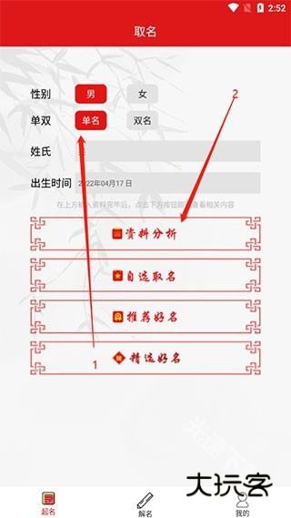 1、在首页输入自己或者伴侣的名字,点击资料分析可以看到这个名字的资料