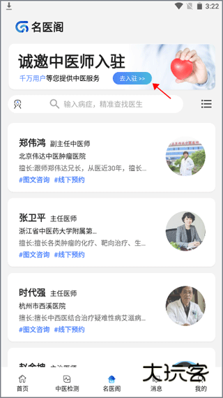 1、打开俏郎中app,点击下方菜单栏“名医阁”,点击该栏目中“诚邀中医师入驻”的按钮。