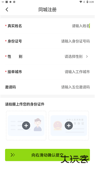 2、按要求填写姓名、证件号码、性别、接单城市,再拍摄上传身份证进行提交,审核通过即可进行接单。
