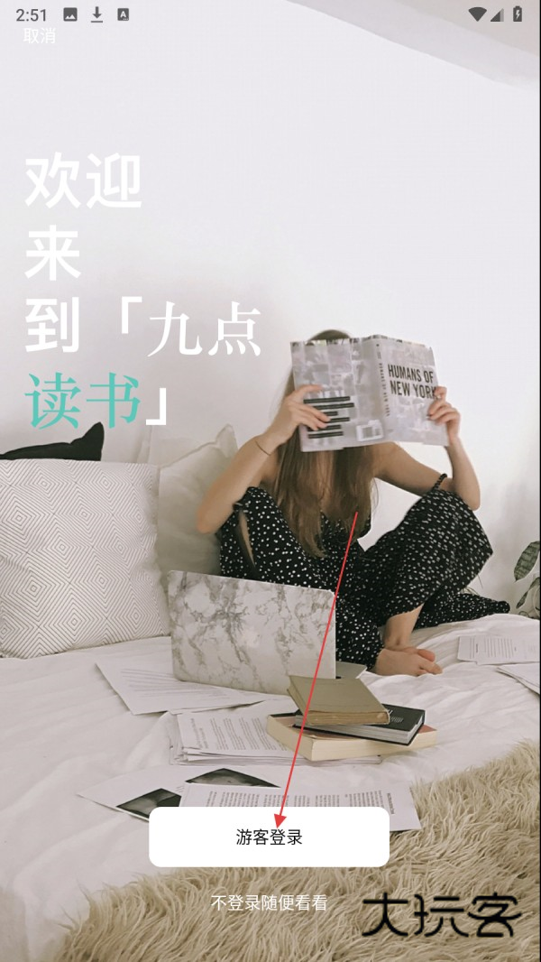 4、在登录选择页面,点击【游客登录】,即可以游客身份使用九点读书。