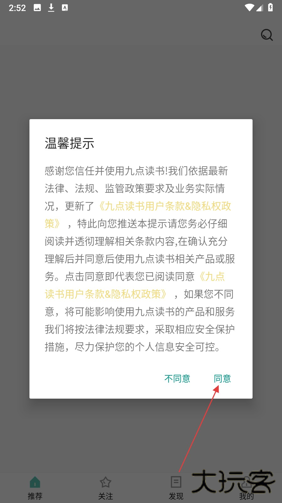 1、首次使用九点读书时,在温馨提示弹窗中点击【同意】,即可进入主界面。